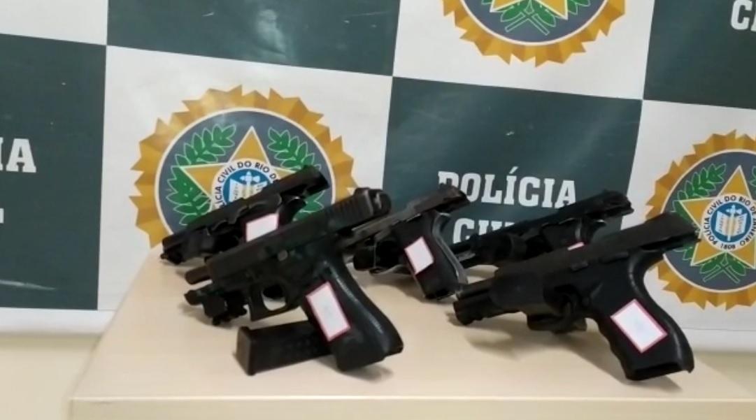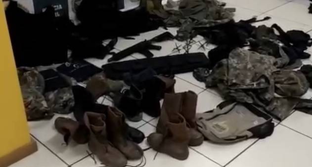 Armas como pistolas semi-automáticas, uma réplica de fuzil, fardas militares e colete balístico foram apreendidos/ Divulgação/Polícia Civil