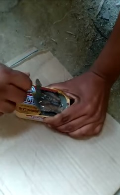 O vídeo começa com o homem chamando a atenção da prefeita para a lata de sardinha: “Drª Fernanda, aqui é pra você, que mandou sardinha e arroz para nossas crianças comerem. Dá uma olhadinha agora. Olha os bichos dentro da sardinha. Está vendo os tapurus se mexendo?, pergunta ele.