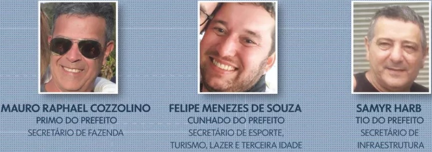 Na lista das exonerações estão Jamille Cozzolino (irmã e vice-prefeita, secretária de Educação e Cultura); Lara Adario Torres (noiva, secretária de Assistência Social e Direitos Humanos); Felipe Menezes de Souza (cunhado, secretário de Esporte, Turismo, Lazer e Terceira idade); e Samyr Harb (tio, secretário de Infraestrutura).