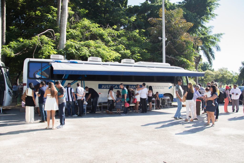 O atendimento, semanal, é realizado com apoio de um ônibus adaptado com equipamentos, mobiliário e pessoal para funcionar como cartório, com um juiz e servidores do Tribunal de Justiça, além de um promotor, um defensor público e serventuários.